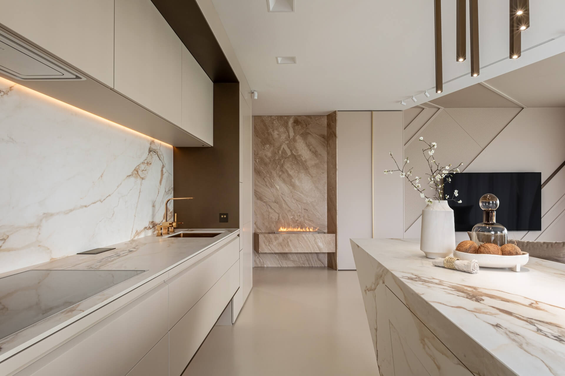 Cichy luksus dąży do spójności i harmonii, zacierając granice między kuchnią a strefą dzienną. Celem jest stworzenie monolitycznej, niemal rzeźbiarskiej bryły, która wygląda jak integralna część architektury budynku, a nie zbiór dostawionych mebli. Kluczowa staje się tu idea całkowitej integracji. Sprzęty AGD znikają za frontami meblowymi. Piekarniki, ekspresy do kawy czy chłodziarki do wina są idealnie zlicowane z powierzchnią zabudowy. Okapy stają się niewidoczne, przyjmując formę systemów blatowych (downdraft) lub sufitowych. Zlewozmywaki są podwieszane lub tworzone na zamówienie z tego samego materiału co blat, by stworzyć jednolitą płaszczyznę. Paleta barw jest stonowana, oparta na barwach ziemi, złamanych bielach, odcieniach greige (połączenie szarości i beżu), głębokich zieleniach, granatach czy graficie. To kolory, które budują atmosferę spokoju i wyrafinowania. W takim podejściu rezygnuje się z tradycyjnych uchwytów na rzecz frezowanych krawędzi frontów lub minimalistycznych systemów otwierania dotykowego (push-to-open), co dodatkowo potęguje wrażenie czystości formy.